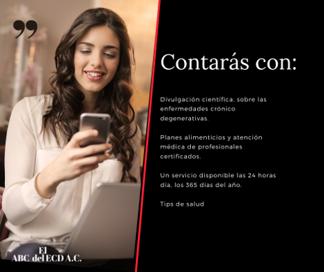 ECD plus, es una herramienta, que te permitirá tener acceso a una información actualizada, veraz y con un lenguaje sencillo, de las investigaciones más recientes que se están llevando a cabo por los investigadores del mundo, sobre las enfermedades crónico degenerativas y conocer más sobre tu enfermedad y tu cuerpo, podrás tener acceso a una atención personalizada por nuestro equipo de profesionales, quienes te brindarán un plan alimenticio y atención médica, todo desde la comodidad de tu casa, oficina o donde te encuentres, con la garantía de ser atendido por personal certificado, el cual estará disponible las 24 horas del días los 365 días del año.